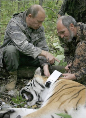 Во время визита Путина, в одну из ловушек заповедника попала 5-летняя самка. Премьер в составе научной группы поспешил к этому месту. Во время осмотра, тигрица вырвалась из ловушки. Но Путин успел одним выстрелом транквилизатора положить животное на лопатки. Премьеру позволили собственноручно одеть зверю спутниковый ошейник.