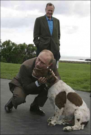 Прибыв в поместье американского президента Джорджа Буша, российский руководитель Владимир Путин поздоровался с его собакой. На заднем плане стоит Джордж Буш-старший