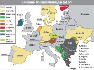 Карту Европы с наиболее распространенными фамилиями, которые обозначают профессии, составил албанец Марчин Кюра. Больше всего в Европе проживает потомков кузнецов и мельников. Регионы, где самыми распространенными являются фамилии священников - преимущественно православные. Там церковники низших рангов не давали обет безбрачия. По тому же принципу популярны имамы в мусульманских странах - Боснии, Албании, Косово. В Каталонии, в отличие от остальной Испании, самая распространенная фамилия Феррер - кузнец. Больше всего Мерфи - морских воинов - живут в Ирландии.