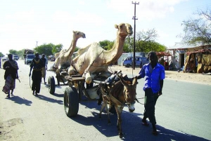 Сомалиец везет изможденных верблюдов в столицу Могадишо. В этом году в Сомали в апреле совсем не было дождей. У верблюдов началась "болезнь от засухи". У них подкашиваются ноги, появляются судороги. Более сильных пустят пастись, а безнадежно больных в больших городах продадут на кожу и мясо.