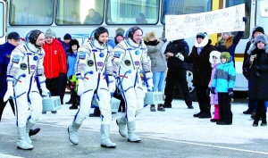 Жена и дети голландского космонавта Андре Кюйперса, справа, держат плакат с надписью "Удачи, папа!". Кюйперс, россиянин Олег Кононенко, в центре, и американец Дональд Петтит, новый экипаж Международной космической станции, идут на стартовую площадку космодрома Байконур, Казахстан. В среду они вылетели к МКС на космическом корабле Союз ТМА-03М.