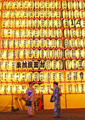 Японки в национальных костюмах развешивают фонарики во время ежегодного фестиваля Митама в токийском храме Ясукуни.