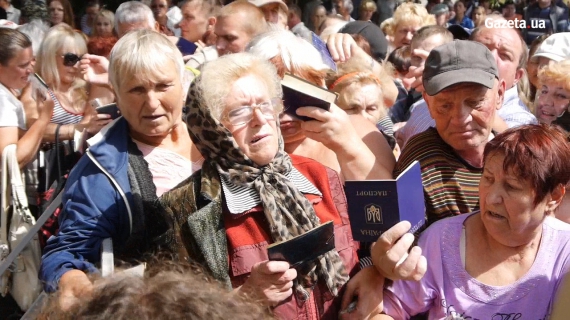 На ул. Рокоссовского палатка вдвое меньше. В очереди около 300 человек, между пенсионерами больше молодежи, чем на ул. Пушкина. Первым стоит 35-летний блондин в бежевой футболке, из-под которой выглядывает большое пузо. "Заходят тут по два человека. Стою з 4 утра. В среду пришел в 5, так оказался сотый", - рассказывает он.